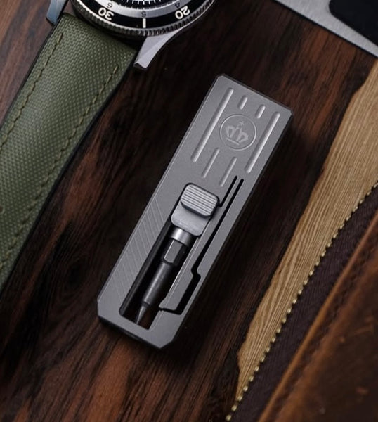 The Slidecatch is the first Titanium Everyday Carry (EDC) tool to feature custom precision bit watch tools! It is perfect for doers, makers, builders, and yes, even watch enthusiasts. The Slidecatch combines the elements of a portable screwdriver with the sleekness and fun of a retractable blade! Stunningly slim, portable, and just downright a blast to use. Utilitarian at its core, this all Titanium tool accepts standard 4mm hex bits so you can carry exactly what you need, when you need it. Whether you’re looking for a pocket-ready tool for tuning your camera gear, adjusting the brakes on your mountain bike, or a spring bar tool for swapping out watch bands, the Slidecatch has you covered!